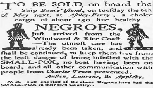 on board the Ship Bance-Uland, on tuesday the 6th of May next, at Asbley-Ferry, a choice cargo of about 250 fine healthy NEGROES, just arrived from the Windward & Rice Coast. The utmost care has already beentaken, and shall be continued, to keep them free from SMALL-POX, no boat having been on board, and all other communication with people from Charles-Town prevented.