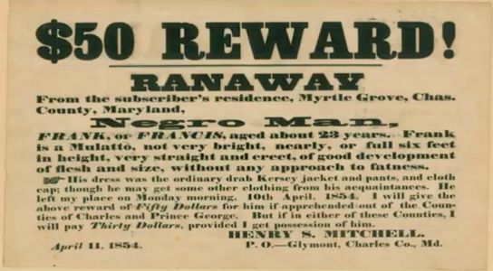 His dress was the ordinary drab Kersey jacket and pants, and cloth cap; thought he may get some other clothing from his acquaintances. He left my place on Monday morning, 10th April, 1854. I will give the above reward of Fifty Dollars for him if apprehended out of the Counties of Charles and Price George. But if in either of these Counties, I will pay Thirty Dollars, provided I get possession of him.
