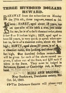 Ran away from the subscriber on Monday the 17th ult., three negroes, named as follows: Harry [Henry], aged about 19 years, has on one side of his neck a wen, just under the ear, he is of a dark chestnut color, about 5 feet 8 or nine inches hight [sic]; Ben, aged aged [sic] about 25 years, is very quick to speak when spoken to, he is chestnut color, about six feet high; Minty [Harriet], aged about 27 yers, is of a chestnut color, fine looking, about 5 feet high. One hundred dollars reward will be given for each of the above named negroes, if taken out of State, and $50 each if taken in the State.