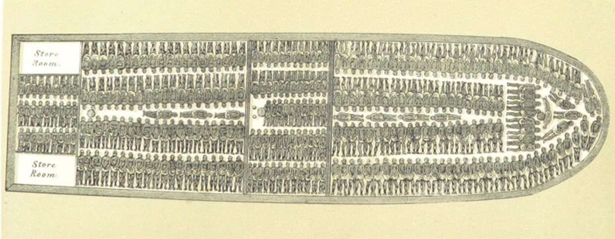 Unfortunately this diagram of the 'Brookes' slave ship was not distributed in the colonies / the United States, but served as a very useful Abolitionist tool in England and the rest of the United Kingdom. By April 1787 this lithograph was probably the most widely copied, distributed and powerful image used by the abolitionist campaigners. Appearing in newspapers, pamphlets, books and even posters in coffee houses and pubs, it depicts the ship loaded to its full capacity - 454 people crammed into the hold. The 'Brookes' sailed the passage from Liverpool via the Gold Coast in Africa to Jamaica in the West Indies.